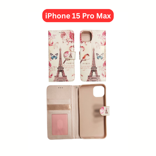 Protect your device in style with the iPhone 15 Pro Max Wallet Printed Case. This premium flip wallet case features a secure magnetic closure, card slots, and a stand function, while showcasing unique designs: Tower, Butterfly, Heart, Larger Butterfly, Loving Heart, Flower, and Purple Flower. A perfect blend of style, functionality, and daily protection.